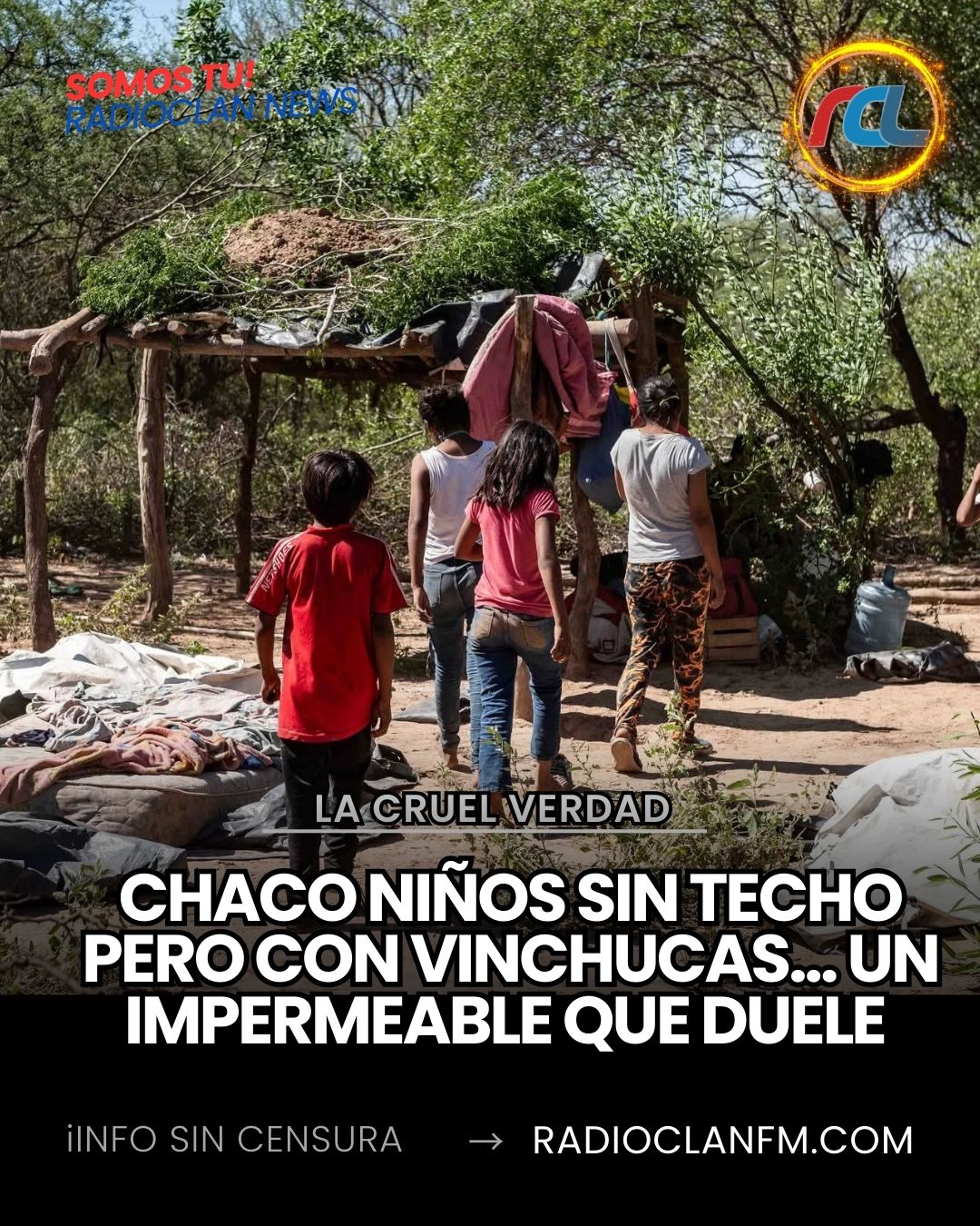 No es una postal antigua. Es hoy. Colchones sobre la tierra, techos de barro sostenidos por ramas, nylon como única protección, sin baño, sin agua segura, sin luz. Niños creciendo entre polvo, calor extremo y enfermedades evitables.