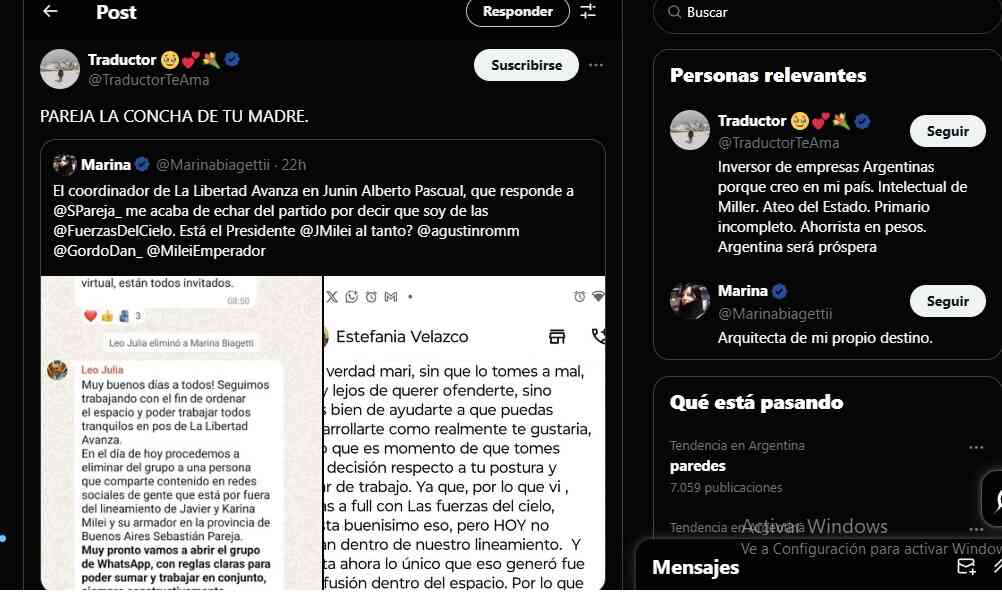Junto a su tuit, Biagetti publicó la captura de un chat junto a Estefanía Velazco, una dirigente de Pareja de Junin. “Y la verdad Mari, sin que lo tomes a mal, muy lejos de querer ofenderte, sino más bien de ayudarte a que puedas desarrollarte como realmente te gustaría, creo que es momento de que tomes una decisión respecto a tu postura y lugar de trabajo. Ya que, por lo que vi, estás a full con Las fuerzas del cielo, y está buenísimo eso, pero hoy no están dentro de nuestro lineamiento. Y hasta ahora lo único que eso generó fue confusión dentro del espacio”, le dijo Velazco.